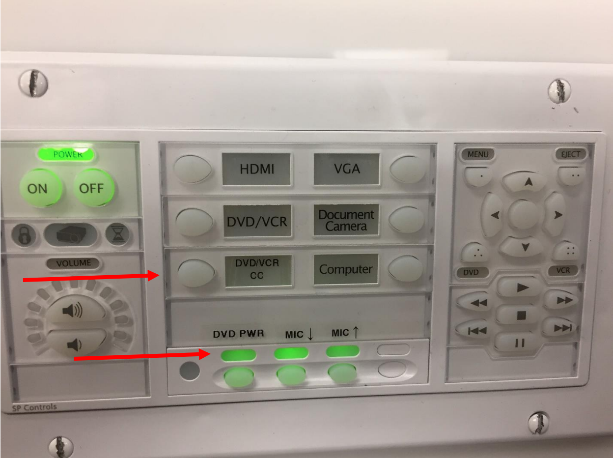 On the newly updated control panel, there is now a dedicated button called DVD/VCR CC. If you want to use the DVD/VCR player to play media and want to display Closed Captioning, you would press this button. If you want to play without Closed Captioning, then you would press the DVD/VCR button only.